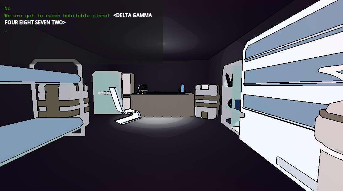 Ah Captain! Good to see you. You have thawed from stasis completely confused and bewildered aboard your intergalactic transport vessel. You were expecting that you would awaken to see new-earth (habittable planet DELTA GAMMA FOUR EIGHT SEVEN TWO) out of the ship windows. However all you see is vast inter-system space!
